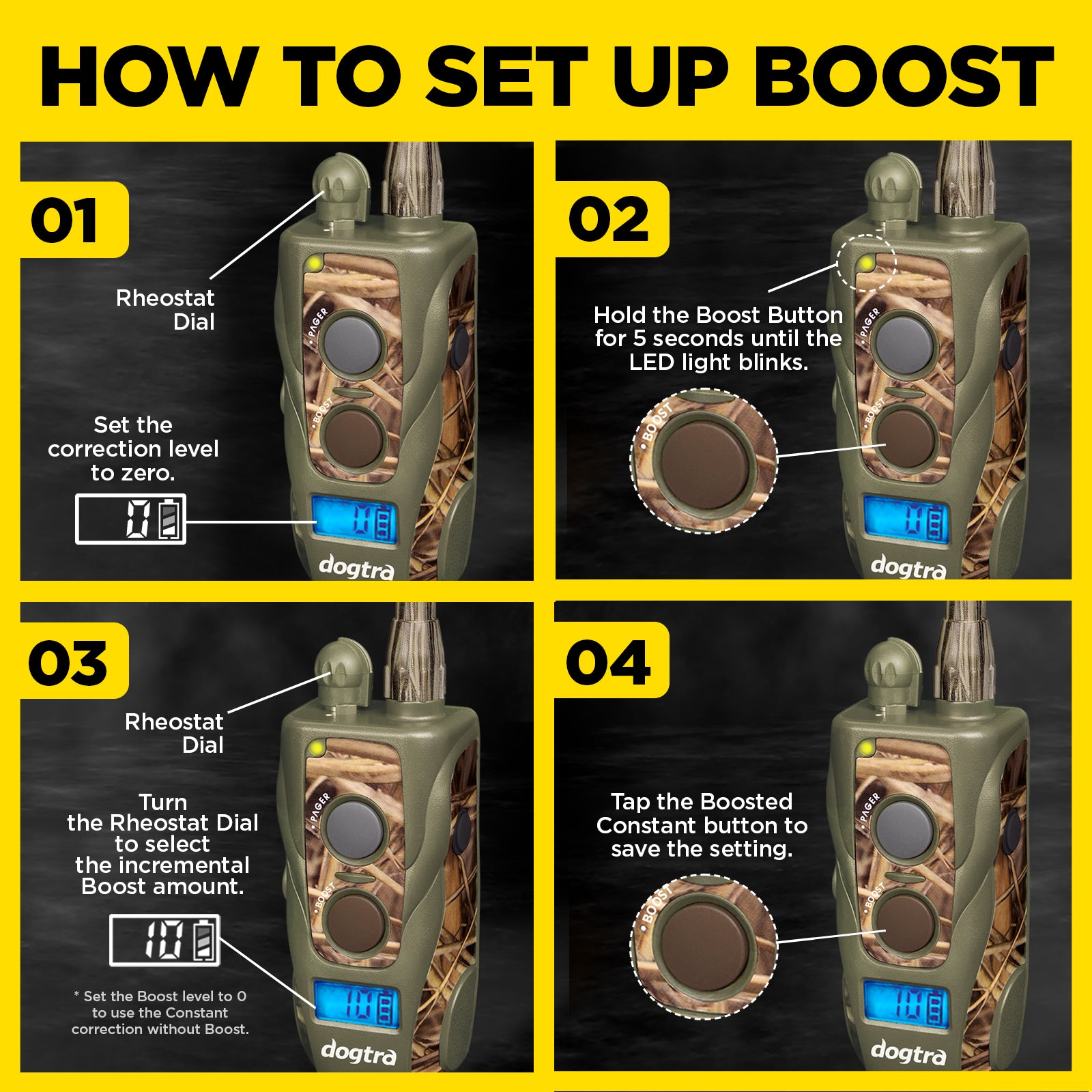 Newly updated Dogtra 1900S WETLANDS BOOST & LOCK Waterproof Remote E-Collar now with Boost & Safety Level Lock. This hunting remote e-collar is designed for waterfowlers features a IPX9K waterproof rating ready for your next gundog adventure. The 1900S WETLANDS BOOST & LOCK is a 1-dog e-collar system designed for large hunting dog breeds 35 pounds and above with a high output and long range training functions.