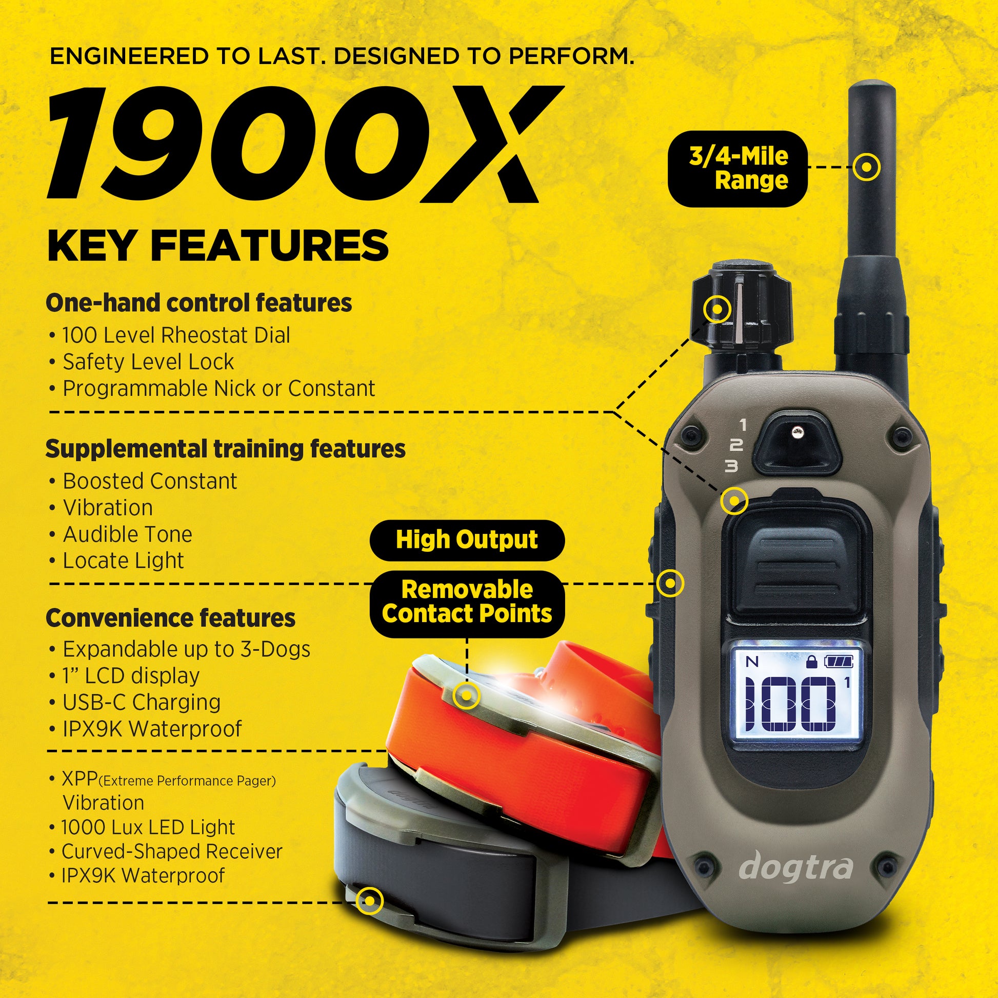 The Dogtra 1900X is built for trainers and owners who demand reliability. This two dog set features a full 3/4 mile range, BOOST for immediate recall, and XPP vibration for instant attention, you’re in control when it counts. The protective e-collar case acts like armor for your collar, adding extra toughness for the harshest conditions. Plus, the LED light keeps your dog visible in low-light environments. Whether you're training in the field or tackling rugged terrain, the 1900X is your go-to for durable, no-nonsense performance. This is gear that’s built to last.