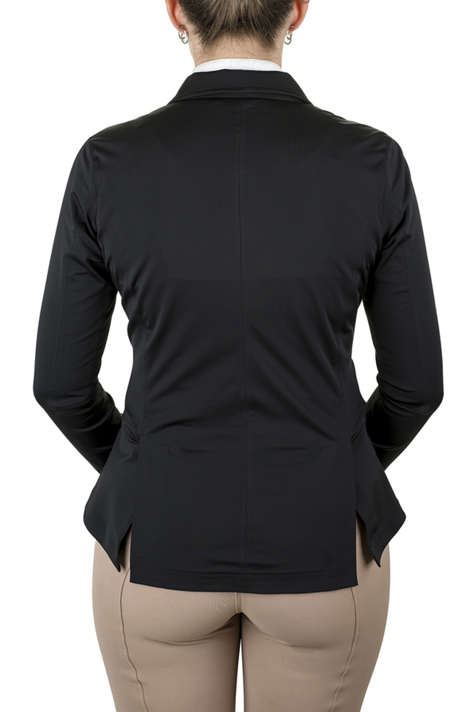 The Equine Couture Ladies Ultra Light Show Coat is the ultimate lightweight coat for summertime horse shows. A seamless feel is achieved with ultrasonic bonding; no itchy or bunching seams! Achieve that flawless shape and smooth lines, making for an elegant picture in the saddle. Super light weight fabric keeps you feeling like a feather and gives the perfect amount of stretch for unhindered movement. Snap buttons for easy on/off paired with a zipper avoid unflattering gaps. Cell phone-sized double pockets let you keep your phone or hold your gloves while waiting for your next class. Infuse style and comfort in the show ring with the Ladies Ultra Light Show Coat.